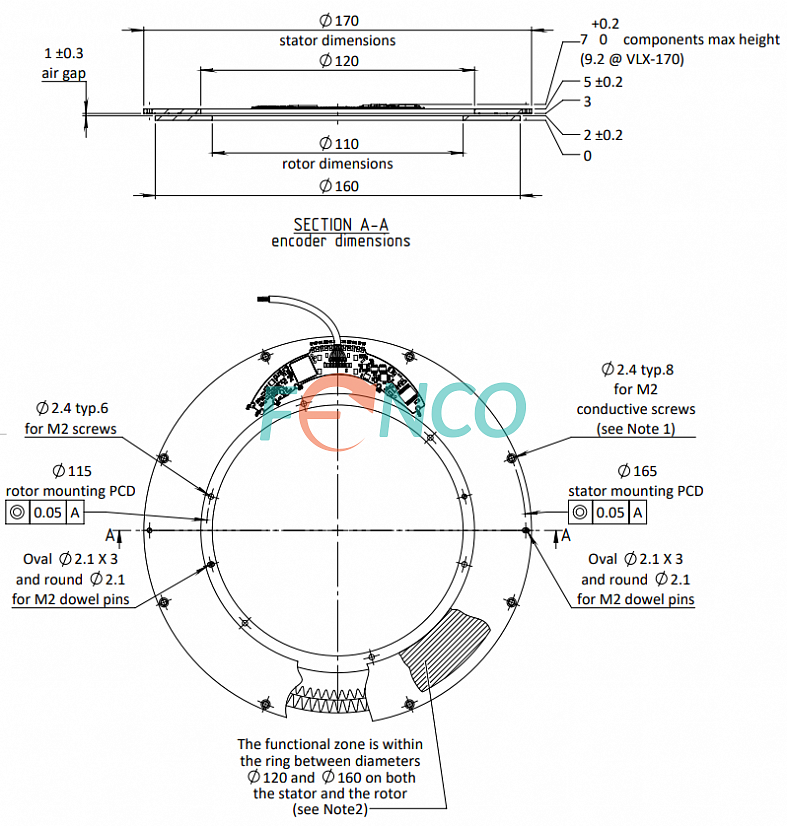 Угловой емкостной энкодер VLT-170 состоит из двух основных компонентов: статора и ротора. Его размеры соответствуют общепромышленным стандартам, с наружным диаметром 170 мм и высотой 8 мм. Конструкция включает в себя полый вал, имеющий внутренний диаметр 110 мм. Во время установки энкодера необходимо обеспечить зазор в 0,1 мм между ротором и статором. Электрическое соединение производится через стандартный кабель 250 мм.