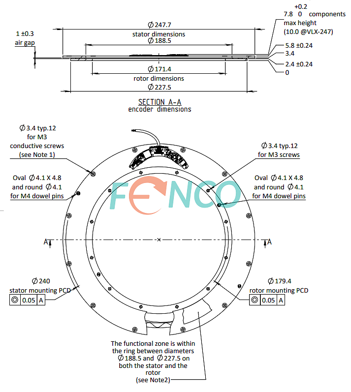 Угловой емкостной энкодер VLT-247 состоит из двух основных компонентов: статора и ротора. Его размеры соответствуют общепромышленным стандартам, с наружным диаметром 247 мм и высотой 9 мм. Конструкция включает в себя полый вал, имеющий внутренний диаметр 171 мм. Во время установки энкодера необходимо обеспечить зазор в 0,1 мм между ротором и статором. Электрическое соединение производится через стандартный кабель 250 мм.