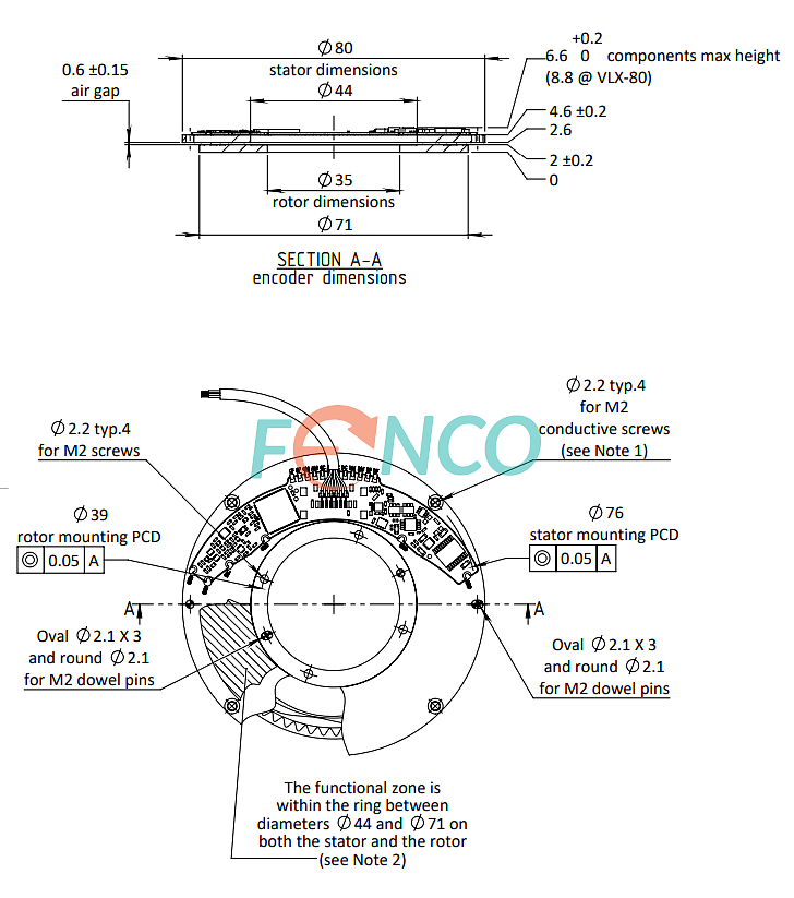 Угловой энкодер VLT-80 производства Netzer состоит из двух основных компонентов: статора и ротора. Его размеры соответствуют общепромышленным стандартам, с наружным диаметром 80 мм и высотой 6,6 мм. Конструкция включает в себя полый вал, имеющий внутренний диаметр 25 мм. Во время установки энкодера необходимо обеспечить зазор в 0,1 мм между ротором и статором. Электрическое соединение производится через стандартный кабель 250 мм.