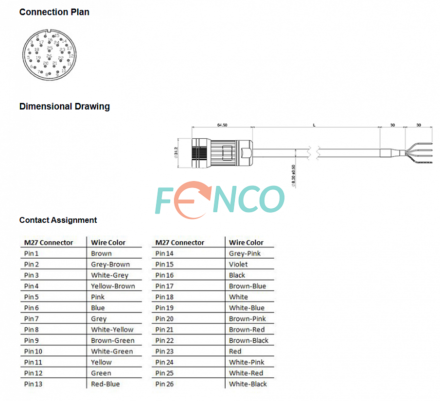Общее описание кабеля с разъемом M27 10013316 - CBL-M27S-F26L-020AB-306N-001 Posital Fraba
