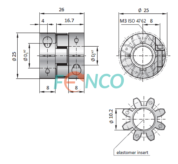 Конструкция муфты выполнена из прочного алюминиевого сплава, устойчивого к износу и коррозии, что гарантирует долговечность и стабильность работы в промышленных условиях. В качестве упругого элемента используется полиуретановая (эластомерная) вставка, эффективно компенсирующая осевые, радиальные и угловые смещения между соединяемыми валами. Такая компоновка снижает уровень вибраций и шума, уменьшает нагрузку на подшипники энкодера и способствует продлению срока службы оборудования.