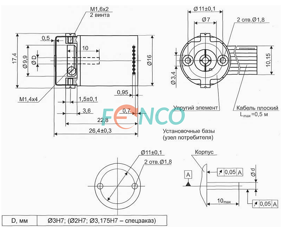 Диаметр корпуса миниатюрного энкодера - 16 мм. В стандартном исполнении имеет глухой полый вал диаметром 3 мм. Возможно исполнение с валом 1,5 или 2 мм, или 1/8". Конструктивное исполнение с радиальным плоским кабелем длиной 0,5 метра. Кабель может быть оснащен разъемом для монтажа на плату.Крепление муфты по бокам корпуса.