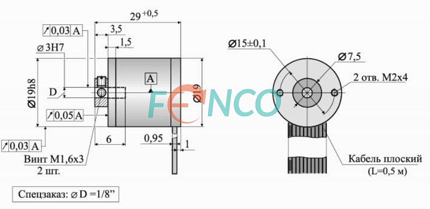 Диаметр корпуса миниатюрного энкодера - 19 мм. В стандартном исполнении имеет глухой полый вал диаметром 3 мм или 1/8". Конструктивное исполнение с радиальным плоским кабелем для монтажа на плату. Длина кабеля - 0,5 или 1 метр. Кабель может быть оснащен разъемом IDC-10G.