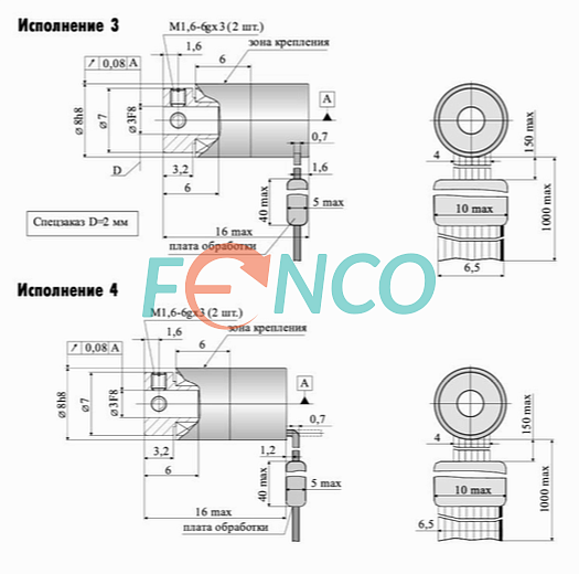Диаметр корпуса миниатюрного энкодера - 8 мм. В стандартном исполнении имеет глухой полый вал диаметром 2 или 3 мм. В зависимости от исполнения может быть оснащен упругим элементом для компенсации несоосности и упрощения монтажа (модели Б и Ж). Плата обработки сигналов в моделях А и Б вынесена за пределы корпуса энкодера, что позволило увеличить разрешающую способность в 4 раза по сравнению с моделями Е и Ж. Конструктивное исполнение с аксиальным плоским кабелем для монтажа на плату. Длина кабеля - 0,5 метра. Кабель может быть оснащен разъемом.