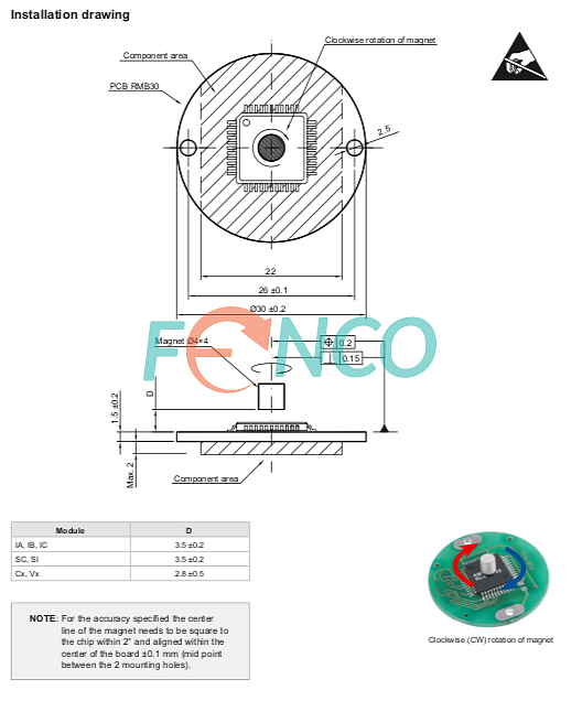 Энкодер состоит из измерительной платы и магнитного актуатора. Диаметр платы - 30 мм. Доступен широкий выбор магнитных актуаторов для посадки на вал диаметром от 4 до 10 мм или для встраивания в вал контролируемого механизма. Конструктивное исполнение под пайку, без разъема на плате.