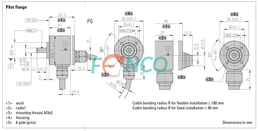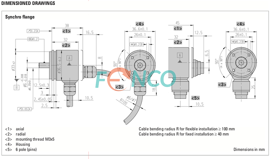 Габарит корпуса 36 мм подходит под общепромышленные требования. В стандартном исполнении имеет цельный вал диаметром 6 или 6,35 мм, пилотный или синхро фланец. Конструктивное исполнение возможно с кабельным выводом или разъемом M16, аксиально или радиально.
