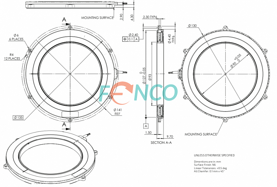 Энкодер DS-130 состоит из трех узлов: два из них имеют элементы электроники и образуют статор, еще один узел - ротор датчика. Габариты корпуса подходят под общепромышленные требования: диаметр - 130 мм, высота - 10 мм. Конструктивное исполнение с большим полым валом: внутренний диаметр ротора - 90 мм. Датчик не имеет подшипникового узла. Электрическое подключение - кабель с разъемом или без разъема.