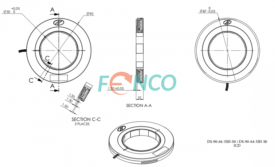 Энкодер DS-90 состоит из трех узлов: два из них имеют элементы электроники и образуют статор, еще один узел - ротор датчика. Габариты корпуса подходят под общепромышленные требования: диаметр - 90 мм, высота - 10 мм. Конструктивное исполнение с большим полым валом: внутренний диаметр ротора - 50 мм. Датчик не имеет подшипникового узла. Электрическое подключение - кабель с разъемом или без разъема.